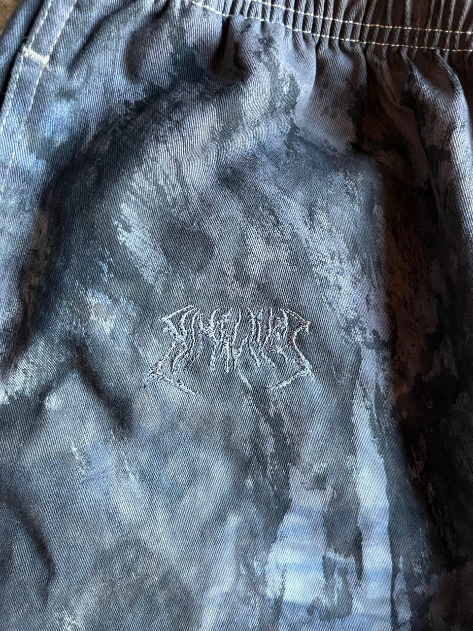 multi dyed canvas pants with prints and embroidery